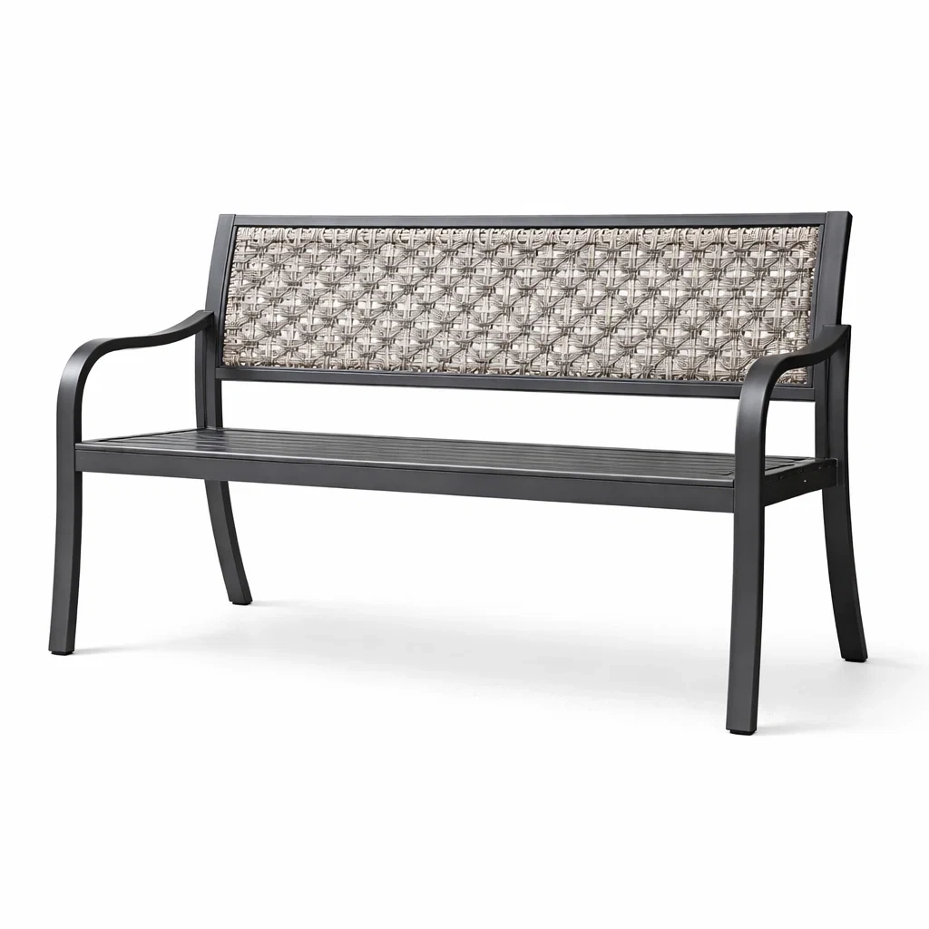 Diese Gartenbank besteht aus pulverbeschichtetem Metall mit einer Rückenlehne aus Kunststoffgeflecht. Die Farbe ist Schwarz mit Beigen Akzenten. Die Maße sind 126 cm in der Länge, 60 cm in der Breite und 85 cm in der Höhe. Diese Bank bietet Platz für 2 Personen.